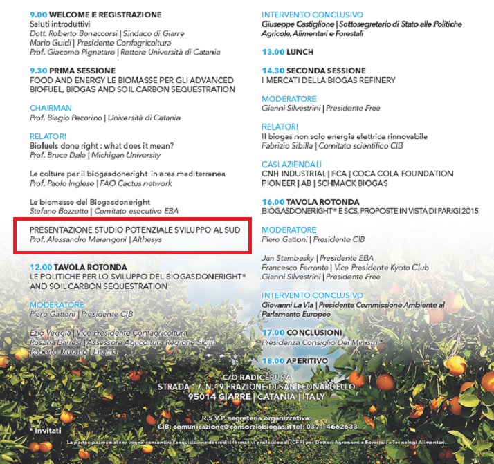 Biogasdoneright and soil carbon sequestration October 9th, 2015 h 9.00 am c/o Radicepura Strada 17, N. 19 frazione di San Leonardello 95014 Giarre (CT) Program: R.S.V.P.:comunicazione@consorziobiogas.it