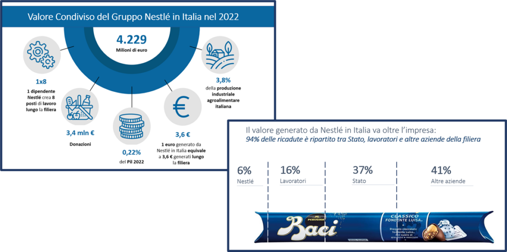 Nestlé Group creates €4.2 billion of Shared Value in Italy, increasing by 5.5% compared to 2020 (€4 billion). The value is equivalent to 0.22% of GDP. The tax contribution generated by the supply chain is €1.5 billion, 0.3% of Italian tax revenues. The Nestlé supply chain creates €1.3 billion in wages and contributions, 0.8% of wages in the manufacturing industry. The value chain employs approximately 62,047 people in Italy (around 12 employees in Italy for every employee of the Group). The 83.6% of employees are concentrated in distribution and sales.