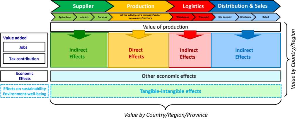 - The assessment starts with company data to estimate upstream and downstream effects concerning the firm; moreover, the estimation examines the set of suppliers (distinguished by sectors), the logistics system and the distribution chain, the latter differentiated by the various distribution channels