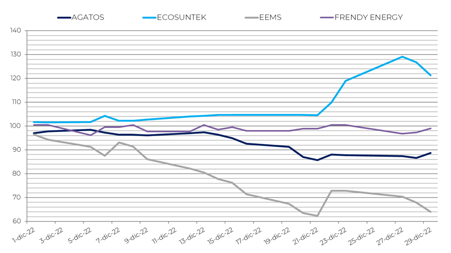 Tra i best performer di dicembre si trova Ecosuntek, unica a rimanere in territorio positivo (+21,3%). Limitano i danni Frendy Energy (-1,0%) e Iniziative Bresciane (-2,8%). Tra i worst performer, invece, si annoverano EEMS (-35,9%), Agatos (-11,3%) e Seri Industrial (-11,2%).