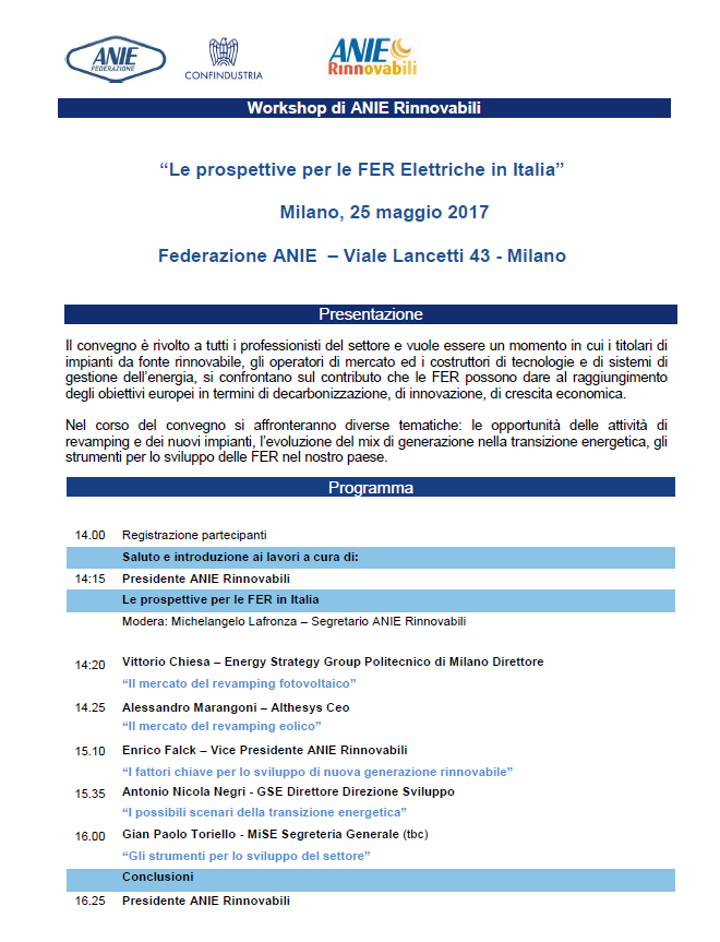 Le prospettive per le FER Elettriche in Italia La Partecipazione gratuita previa registrazione: cliccare qui