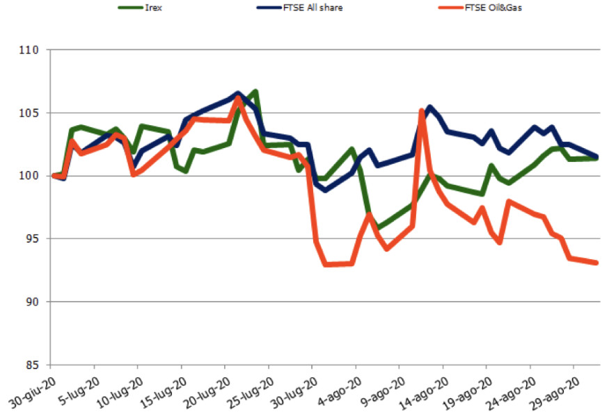 Il mercato petrolifero appare ancora in recupero. La domanda di beni energetici sta subendo una forte decelerazione in tutto il globo per via della crisi pandemica. Ma ora i prezzi del greggio si stanno muovendo verso una moderata ripresa, con il supporto delle misure di controllo dell’OPEC sulla produzione. Il Brent ha chiuso luglio in salita di 2 dollari al barile fino ai 43,3 $/b, con una crescita del 5,3%, e un altro 5,4% è stato messo a segno in agosto, finendo a 45,6 $/b. Il Wti resta sotto le quotazioni del marker europeo, chiudendo luglio a 39,9 $/b, con un incremento mensile del solo 0,4% su giugno, e schizzando ad agosto fino a 42,8 $/b, che equivale a un +7,3% su base mensile. Nonostante le notizie confortanti sul versante prezzi, il crollo della domanda non fa sconti agli attori del comparto. L’indice FTSE Oil&Gas delle quotate italiane nel settore petrolifero ha registrato un pesante -7,0% a luglio, per poi chiudere agosto vicino alla parità (+0,2%).