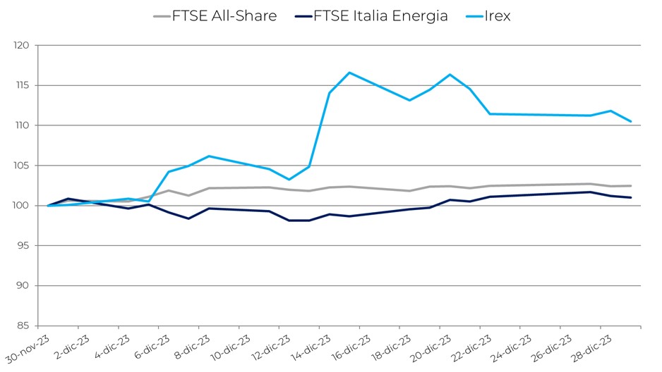 L’indice Irex, che misura l’andamento delle small mid cap pure renewable quotate in Borsa Italiana, ha mostrato una ripresa negli ultimi mesi dell’anno. Dopo i minimi raggiunti ad ottobre e il recupero di novembre, infatti, a dicembre l’indice registra un ulteriore +10,5%. Ciononostante, nell’intero 2023 l’indice ha fatto segnare un deludente -22,5% che riflette le difficoltà di un comparto. Sebbene abbia mostrato buoni risultati sul piano delle nuove installazioni (+5,5/5,8 GW le stime preliminari per l’Italia), il settore ha subito la flessione dei prezzi di mercato e non riesce a superare le incertezze normative e le difficoltà burocratiche che affliggono da tempo il settore. In comparazione, nell’arco degli ultimi 12 mesi, l’indice FTSE All share ha centrato un +26,3% e il FTSE Italia Energia un +10,6%.
