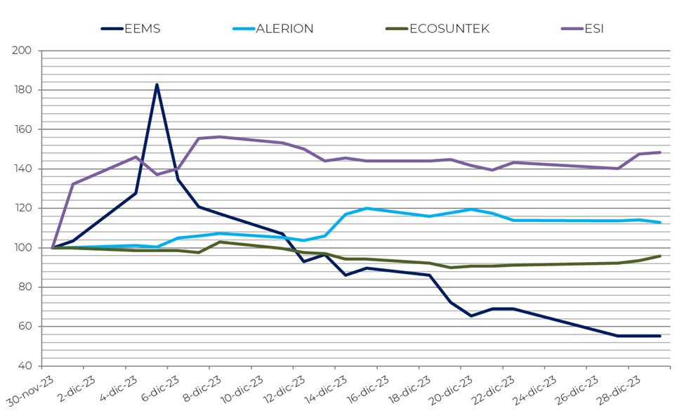 I risultati migliori sono arrivati da Esi (+48,3%), Alerion (+13,0%) e Seri Industrial (+12,5%), mentre le prestazioni peggiori riguardano EEMS (-44,8%), Ecosuntek (-4,2%) e Innovatec (-3,4%).