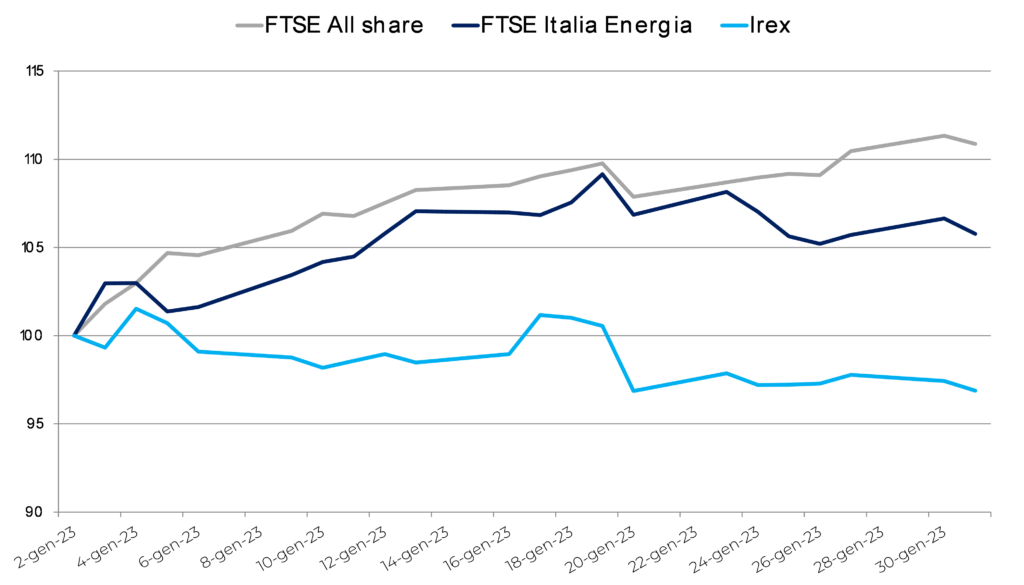 Volano le Borse europee, guidate da quella di Milano. Il FTSE All share si concede un +11,9% nel mese di gennaio, seguito dall’Ibex spagnolo, che chiude a +9,8%. Poco dietro il Cac francese (+9,4%) e il Dax tedesco (+8,7%). Le commodity energetiche continuano la loro discesa: il gas al TTF segna un calo congiunturale del 13%, scendendo a 55,68 €/MWh, mentre il PUN elettrico italiano chiude gennaio a 161,94 €/MWh (-27,81%). Più contenuti i cali degli indici petroliferi, con il Brent sotto gli 85 $/b (84,47) e il WTI sotto gli 80 $/b (79,06). Il calo dei prodotti energetici pesa di riflesso sul listino energetico di Borsa Italiana, il Ftse Italia Energia che, benché in territorio positivo, mostra guadagni più contenuti rispetto al FTSE All Share (+5,6%).