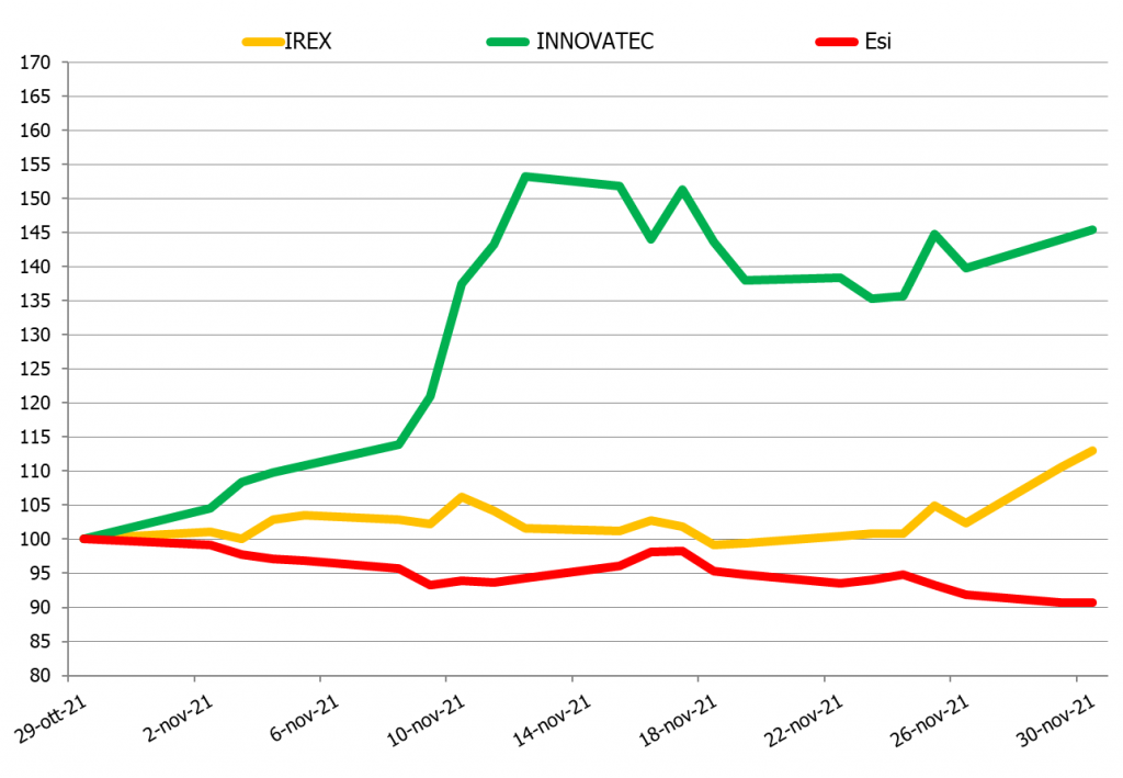 Nel mese di novembre l’indice IREX delle small mid cap pure renewable quotate su Borsa Italiana ha fatto registrare un +13%. Continua, dunque, la forte crescita che, nella seconda parte del 2021, ha caratterizzato l’evoluzione dell’indice.