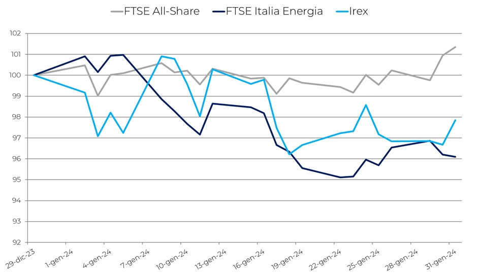 Inizio d’anno negativo anche per l’indice Irex, che misura l’andamento delle small mid cap pure renewable quotate in Borsa Italiana. Dopo il recupero negli ultimi mesi del 2023, l’indice ha, infatti, chiuso gennaio in calo del -2,2% a 97,84. La contrazione, tuttavia, è stata più contenuta di quella del Ftse Italia Energia, segno di una maggior tenuta del comparto rinnovabili rispetto al mercato energetico. Da segnalare il delisting dall’indice di Renergetica a partire dall’8 febbraio, a seguito dell’OPA totalitaria sulla società da parte di CVA.