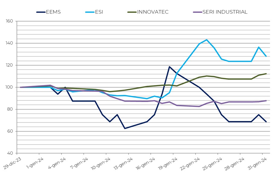 I risultati migliori sono arrivati da Esi (+28,2%), Innovatec (+12,3%) e Ecosuntek (+10,3%) mentre i peggiori sono stati di EEMS (-31,3%), Seri Industrial (-12,3%) e Frendy Energy (-4,4%).