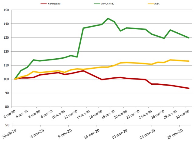 Dopo il crollo di ottobre (-9,6%), l’indice Irex delle small mid-cap pure renewable quotate su Borsa Italiana è in forte ripresa e nel mese di novembre ha segnato un aumento del 13%.