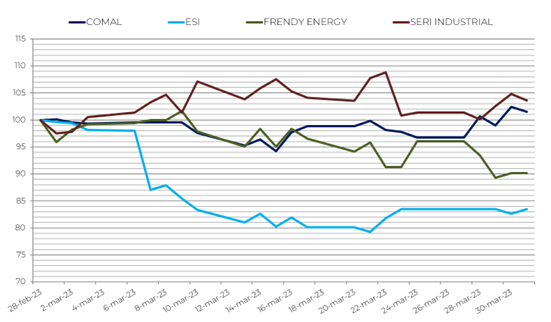 Seri Industrial in leggero recupero dopo il risultato nettamente negativo dello scorso mese (-12,7%), soprattutto dovuto alla difficile congiuntura del comparto batterie europeo generata dall’Inflation Reduction Act (Ira) statunitense. Comal continua, invece, a beneficiare del contratto firmato in gennaio con un investitore estero per realizzare un impianto fotovoltaico in provincia di Viterbo del valore di 53 milioni di euro.