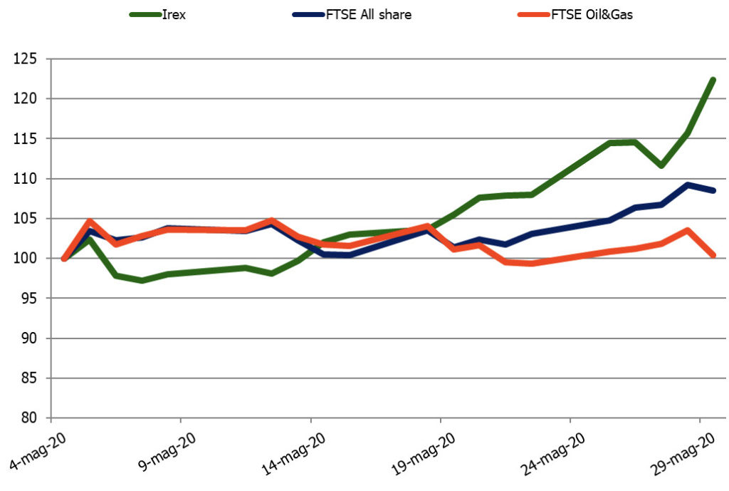 Nel comparto petrolifero, nell’ultimo mese, si avverte un rinnovato ottimismo, grazie agli spiragli sul fronte pandemico, nonostante una serie di tensioni internazionali e interne ad alcuni Paesi. I prezzi hanno segnato sensibili aumenti. Il Brent ha chiuso maggio sui 35,0 $/b, ovvero 10 sopra l’ultimo rilevamento, con una crescita del 38,2%. Rispetto ai valori di inizio anno la perdita si riduce, ora, al -47,0%. Il Wti supera le quotazioni del marker europeo, chiudendo a 35,2 $/b, con un incremento dell’81,6% rispetto al minimo di aprile di 18,4 dollari. L’indice FTSE Oil&Gas, che traccia le quotate italiane, non ha, tuttavia, beneficiato del rialzo dei prezzi, facendo segnare un deludente +0,4% sul mese precedente.
