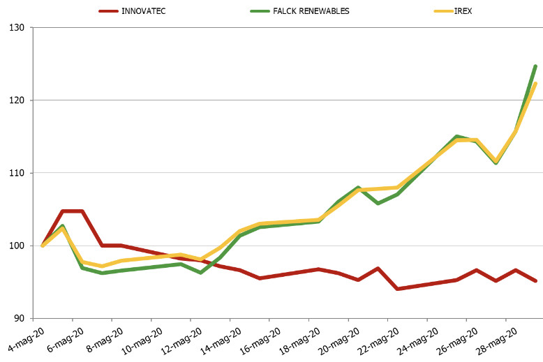 Le migliori performance sono state di Falck Renewables (+24,7%), Alerion Clean Power (+21,4%) ed Enertronica Santerno (+22,2%). Alerion, attraverso la controllata Enermac, si è aggiudicata 51 MW di nuova capacità rinnovabile nell’ambito delle procedure competitive di cui al DM FER 1 per due progetti eolici in Puglia, rispettivamente di 27,2 MW e 23,8 MW, previsti entrare in esercizio entro l’autunno 2021. Renergetica ha sottoscritto una lettera di intenti per vendere delle autorizzazioni a costruire un impianto fotovoltaico in Colombia da 11,2 MW.