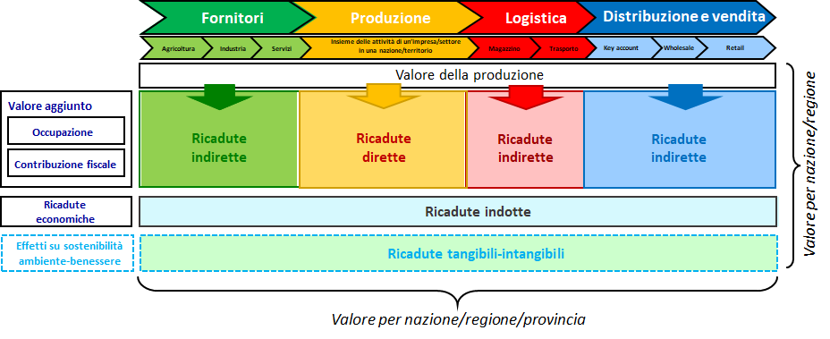 - Il valore aggiunto generato dall’impresa, così come quello che si distribuisce su fornitori e clienti, produce poi effetti indotti, che sono stimati in base a parametri macroeconomici e moltiplicatori specifici per ogni categoria, impiegando dati e fonti terze istituzionali
