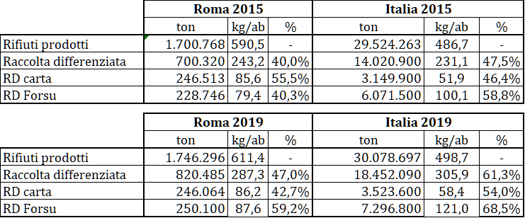 Roma produce oltre 1,7 milioni di tonnellate di rifiuti urbani e sconta un livello di raccolta differenziata inferiore alla media nazionale (47% contro 61% nel 2019) e rimane molto lontana dai migliori casi italiani, che si avvicinano al 90%. Migliora poi molto lentamente rispetto al resto dell’Italia, con la RD che in un quinquennio è passata dal 40% al 47% mentre il Paese nel suo complesso (che include anche varie Regioni meridionali in grave ritardo) passava dal 47,5% al 61,3%.
