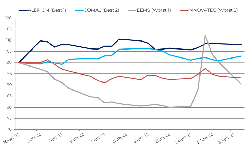 L’assemblea di Eems del 24 ottobre ha delegato il CdA ad aumentare il capitale per un importo massimo di 100 milioni di euro e l’emissione di un prestito obbligazionario fino a un massimo di 20 milioni di euro riservato alla sottoscrizione dell’investitore qualificato Negma Group Investment e convertibile in azioni quotate Eems Italia. Il piano industriale della controllata Eems Renewables evidenzia il nuovo orientamento del gruppo verso le rinnovabili, facendo inizialmente schizzare il titolo del 30%. Titolo che si è, poi, assestato a fine mese sotto la parità a causa della performance negativa delle prime due decadi.