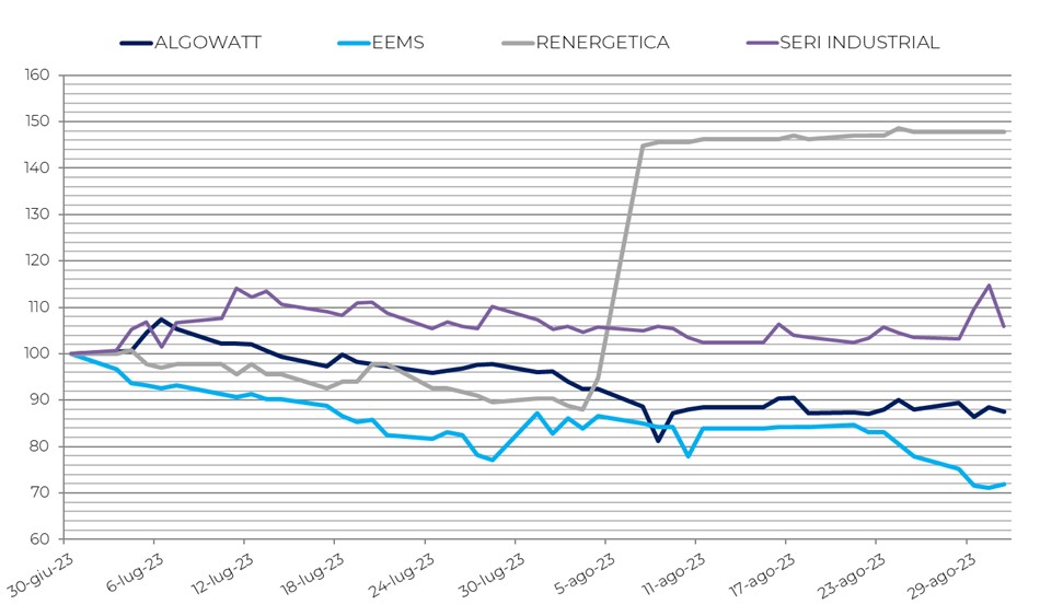 Tra i best performer si trova ancora una volta Renergetica, che vola a +63,6% dopo il +22,9% di giugno. A seguire Ecosuntek con +3,4% e Innovatec con +1,8%. Tra i worst performer, invece, si trovano EEMS, che chiude a -17,6% dopo il -7% di giugno, Algowatt con -8,9% e Agatos con -5,2%.